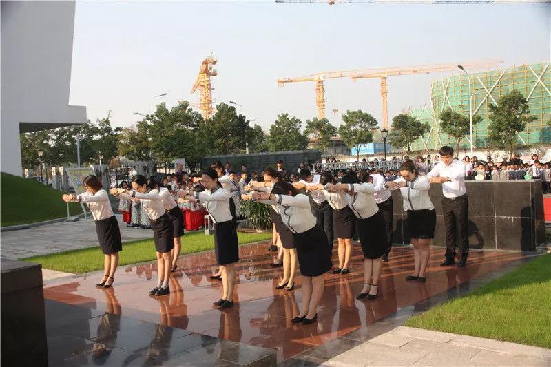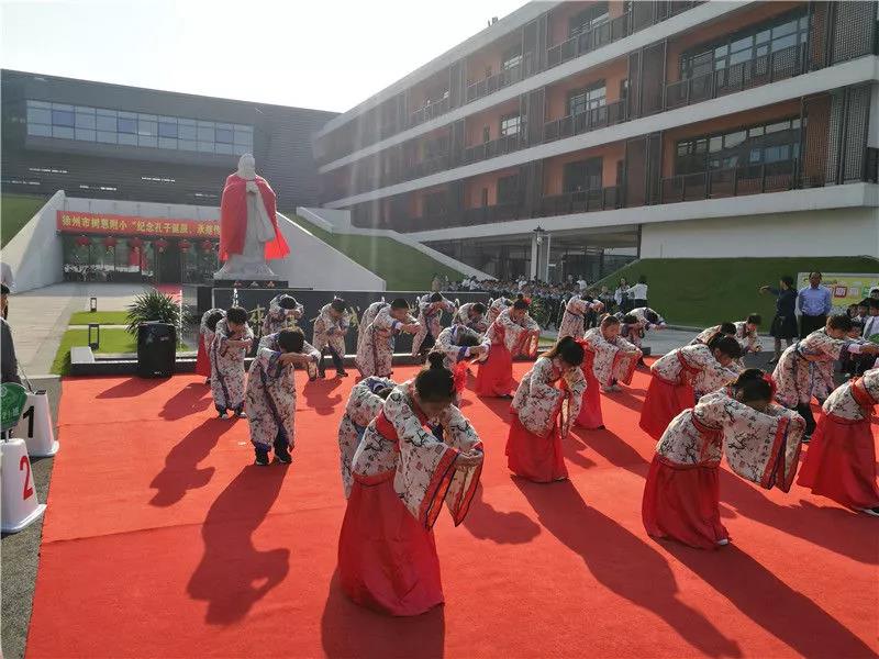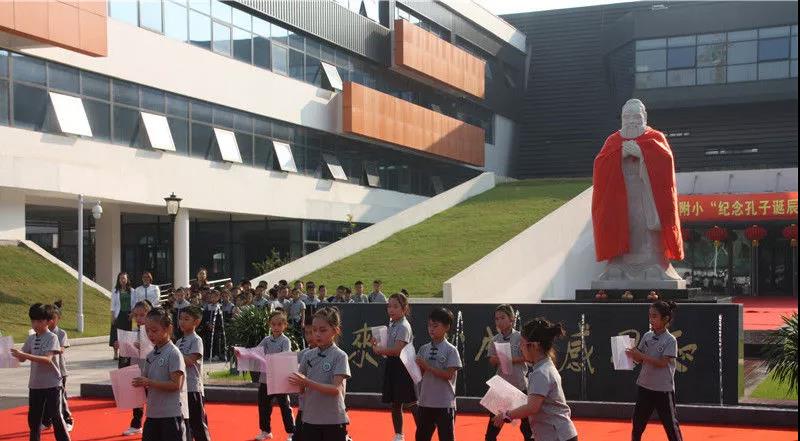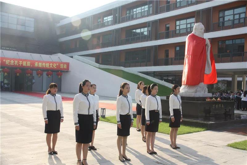 老师们排着整齐的队伍,聚集在孔子像前,在古朴悠扬的音乐声中拉开了祭孔典礼的序幕。