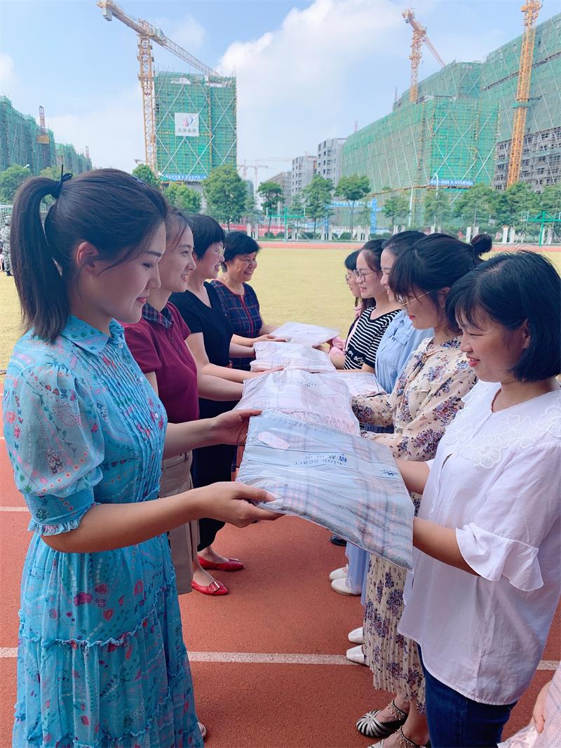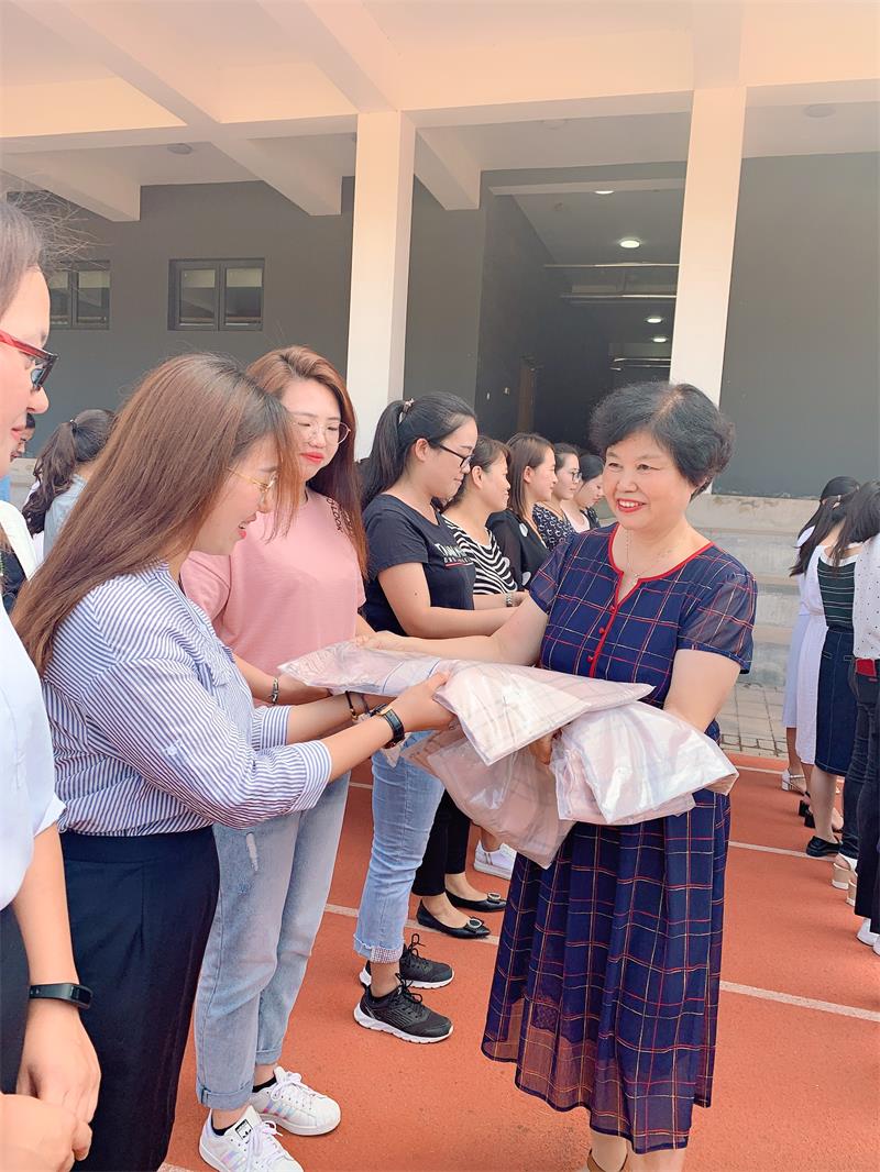 在高铁校区,薛校长、郭总代表董事长把围巾送给老师们